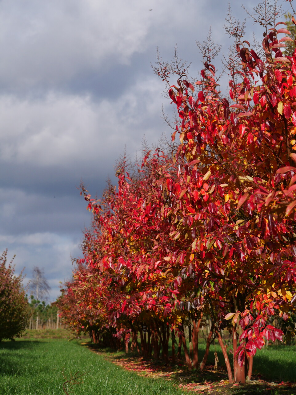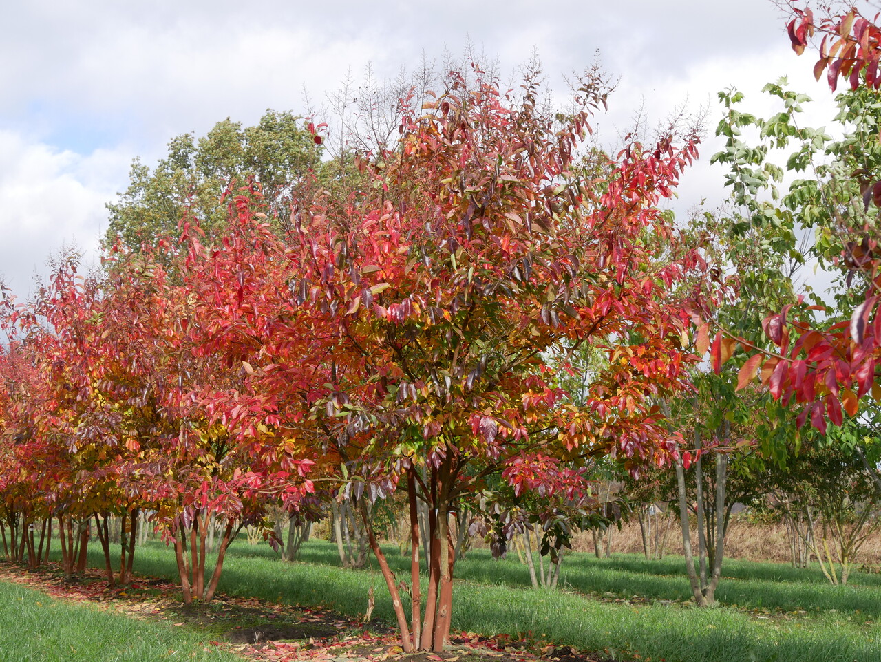 The leaves of Lagerstroemia 'Natchez' turn amarillo, naranja, rojo in autumn.