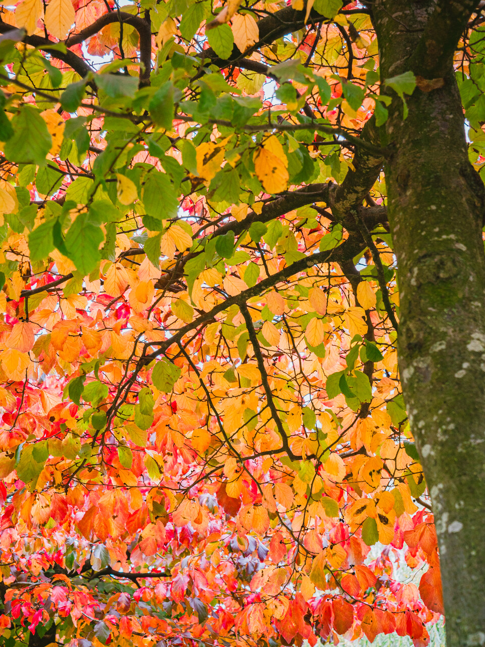 The leaves of Parrotia persica turn amarillo, naranja, rojo, púrpura in autumn.