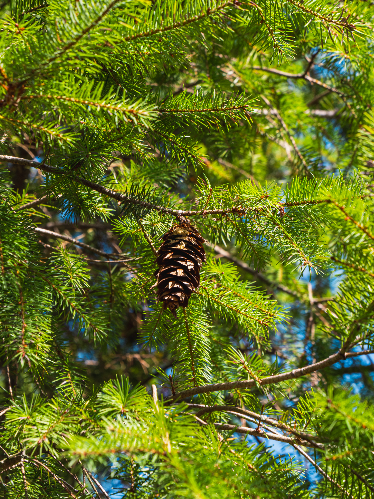 hanging cones, long ovoid, reddish brown, 8 - 10 cm