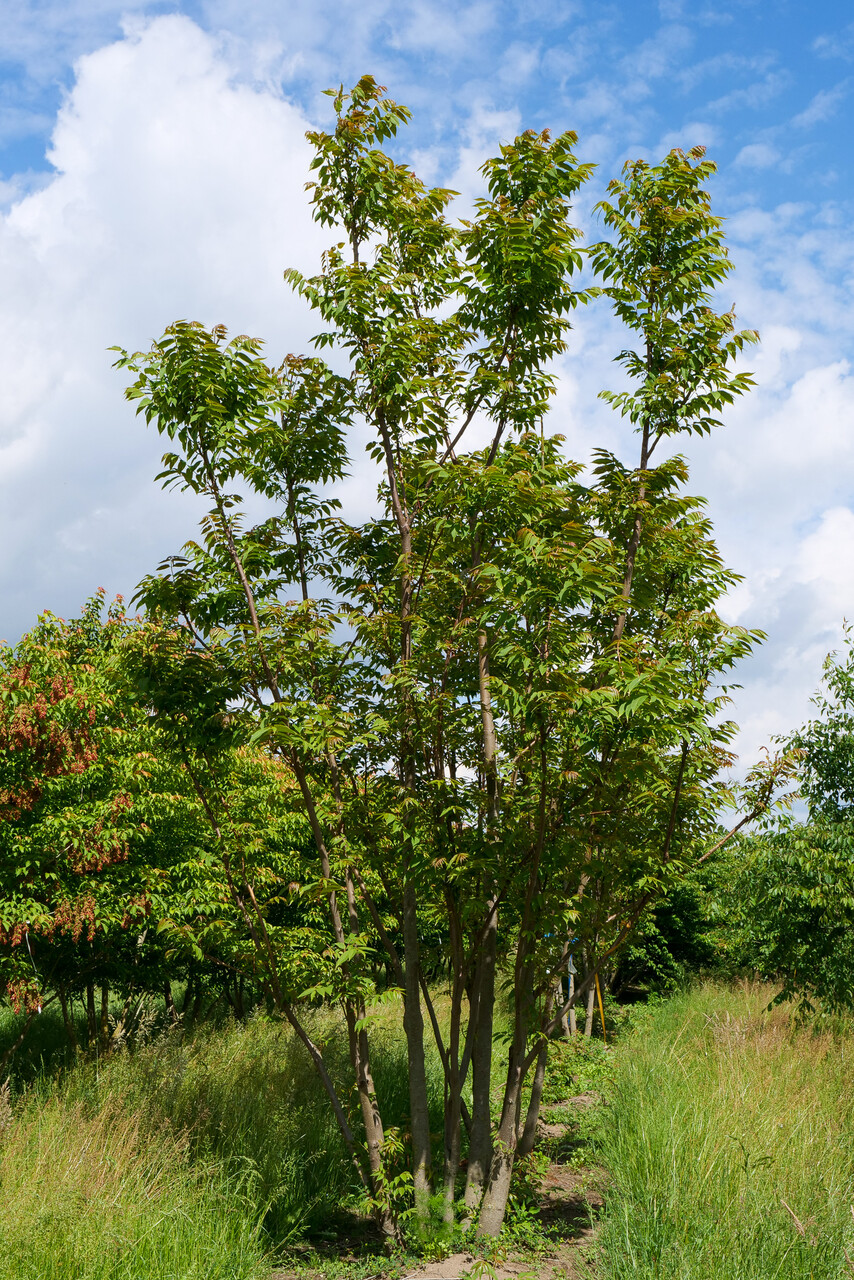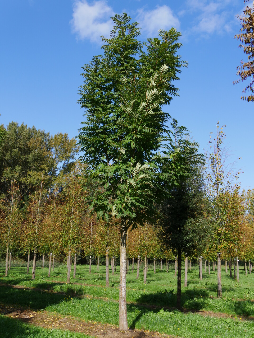 Árbol de tamaño medio especialmente llamativo, que alcanza de 10 a 15 m de altura. Al principio, el árbol crece esbelto y tiene una copa columnar. Más tarde, la copa se ensancha. Las ramas jóvenes son cobrizas y peludas. La corteza vieja es pardo-grisácea, más tarde con grietas longitudinales. Cuando está dañada, la corteza, las ramas y las hojas desprenden un olor desagradable. La hoja, grande y pinnada uniformemente, consta de 20 a 26 foliolos. Éstos tienen la misma forma que en la especie. Al desplegarse, son de color rosa anaranjado intenso, pasando por el amarillo verdoso hasta llegar al verde claro brillante. En otoño, las hojas se vuelven amarillas. Las pequeñas flores, también desagradablemente perfumadas, aparecen en grandes panículas. Tras la floración se forman frutos leñosos en forma de caja que contienen semillas aladas. Las flores y los frutos aparecen sólo en veranos cálidos. Un árbol de parque poco común o solitario.