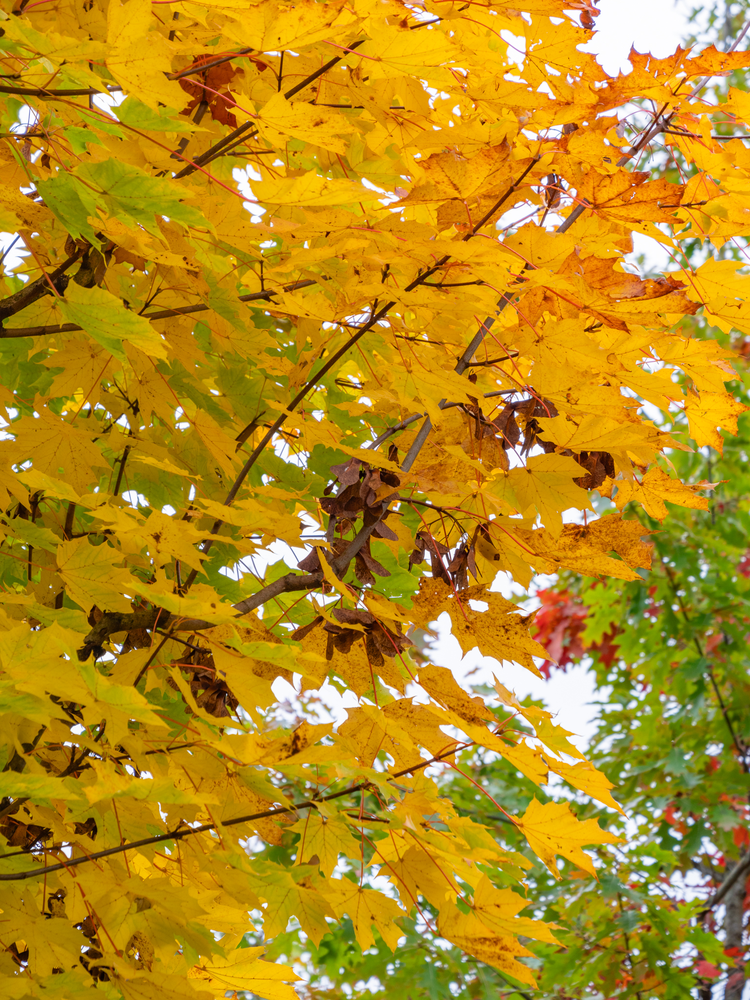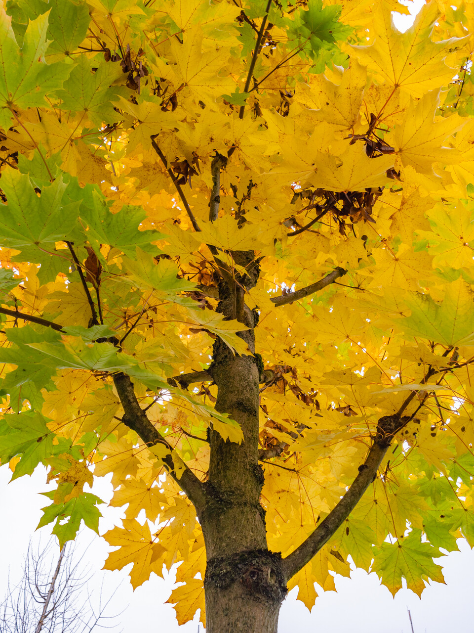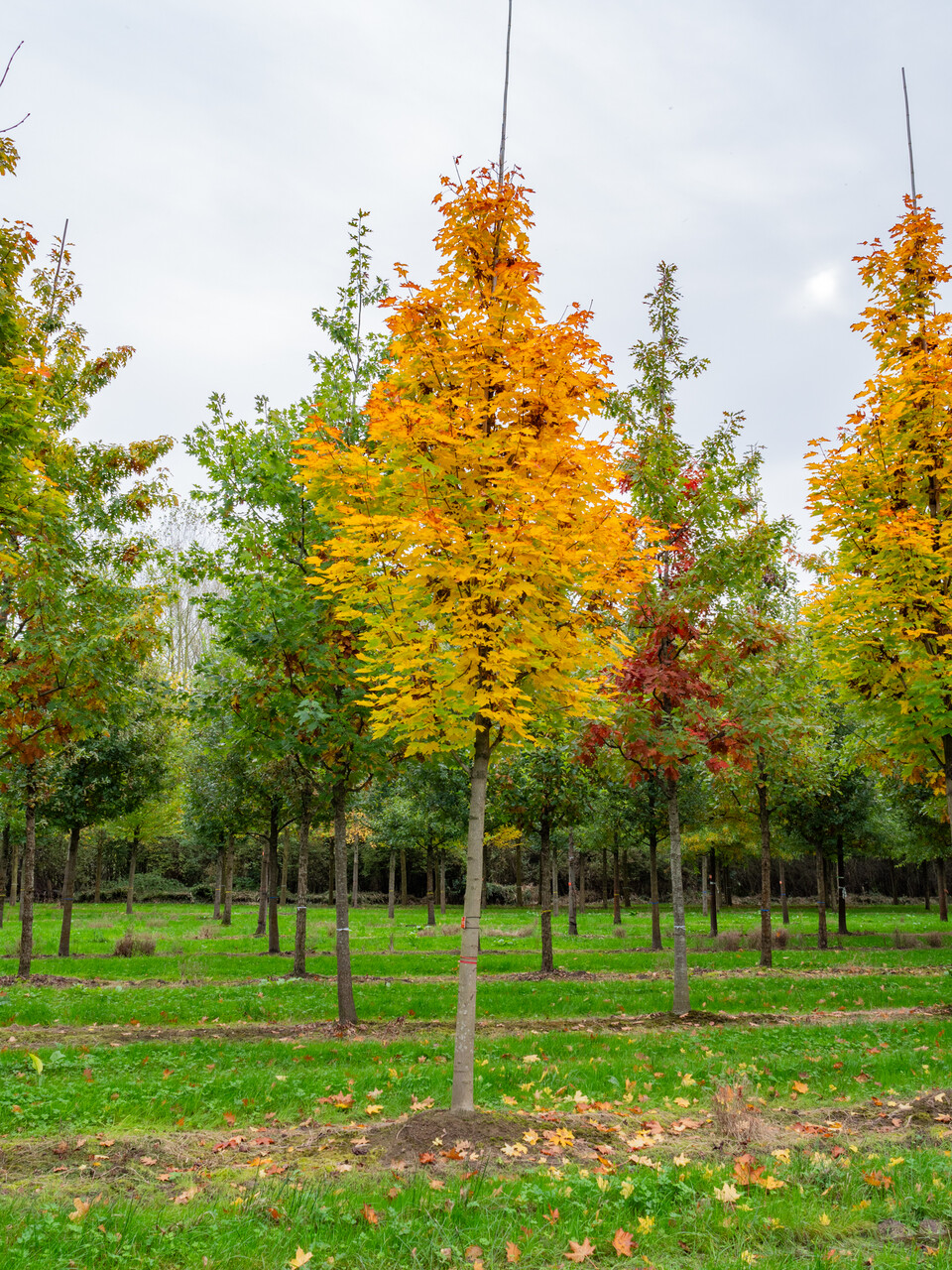 The leaves of Acer platanoides 'Columnare' turn amarillo in autumn.