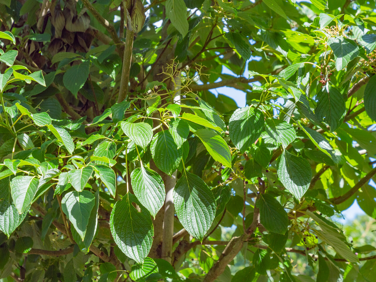 Pequeño árbol cuya principal característica es su ramificación horizontal, creciendo en hileras. En su área de distribución natural, a veces alcanza los 15 m de altura. La copa puede ser tan ancha como alta. El color de las ramitas va del marrón rojizo al gris. Las hojas alternas son irregulares en forma y tamaño y tienen un color verde oscuro brillante. El envés es de un llamativo verde azulado. En otoño se vuelve rojo púrpura. Los corimbos florales en forma de umbela pueden alcanzar unos 15 cm de diámetro. Surgen de tallos cortos y se disponen a lo largo de ramas horizontales. En otoño aparecen numerosas bayas de color azul oscuro. En los Países Bajos, la fructificación es muy variable y, desde luego, no está garantizada. Enraíza superficialmente con un sistema radicular fino. Debido al temprano flujo de savia en primavera, la poda debe realizarse en verano u otoño.