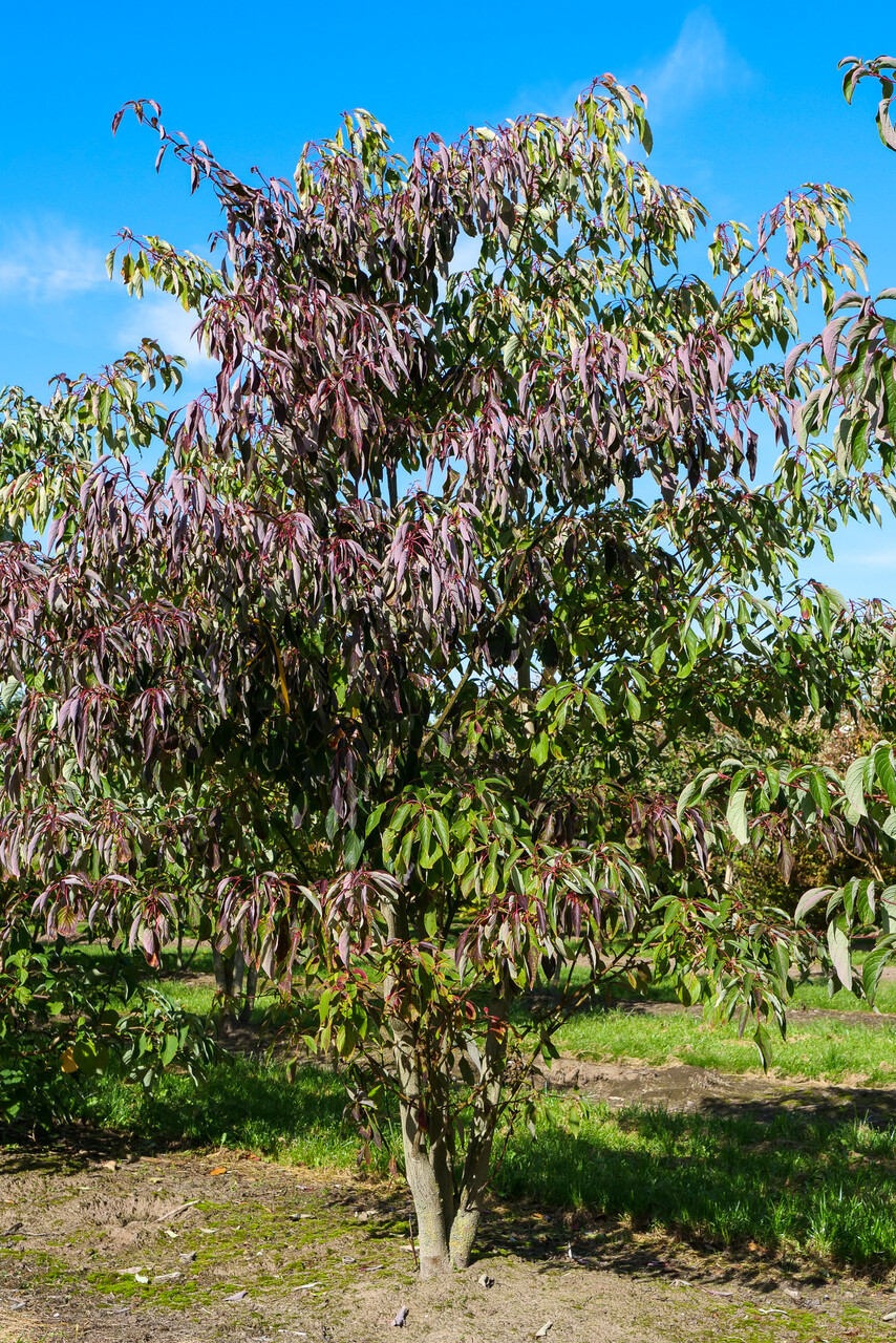The leaves of Cornus controversa turn rojo, púrpura in autumn.