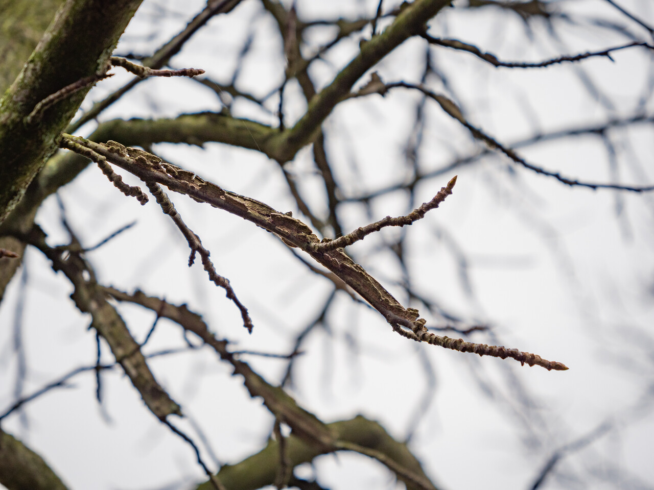 dark grey, deeply grooved, corky wings on branches and twigs