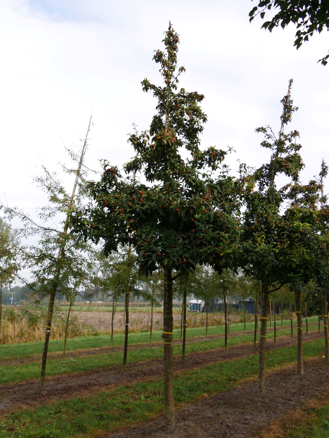 Pequeño árbol de crecimiento lento con ramas principales pesadas y una copa esférica errática y aplanada de unos 6 m de altura. Las ramas jóvenes son grises y lanosas, mientras que la corteza más vieja es gris claro y lisa. Las hojas, de oblongas a ovoides invertidas, están finamente dentadas y, sobre todo cuando son jóvenes, son ligeramente vellosas. En otoño se vuelve de marrón rojizo a amarillo dorado intenso. Los frutos, marrones y duros, tienen unos labios del cáliz notablemente grandes y sólo son comestibles cuando empiezan a pudrirse. Esto suele ocurrir después de las primeras heladas nocturnas. Los frutos de la 'Westerveld' son ligeramente más grandes que los de la especie y se garantiza que esta variedad da frutos muy grandes todos los años. Fue incluida y nombrada en la inspección del Servicio General de Calidad de la Horticultura holandesa (NAKB) por el vivero Westerveld hacia 1975. De raíces profundas. Tolera los suelos calcáreos, es muy rústica y especialmente resistente al calor.