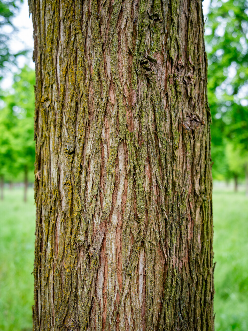El tronco de los árboles más viejos desarrolla una textura nudosa y se desprende en placas estrechas. Las ramas jóvenes son de color marrón rojizo. Las acículas del árbol se encuentran tanto en los árboles de hoja corta como en los de hoja larga y son opuestas, lo que los diferencia de los Taxodium. En otoño, las acículas cambian de color a marrón bronceado a marrón anaranjado, y caen junto con los brotes cortos.