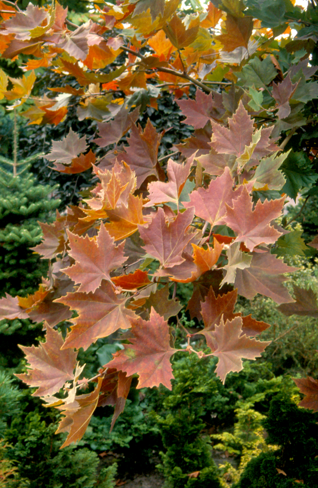 The leaves of Platanus orientalis 'Mirkovec' turn rojo in autumn.