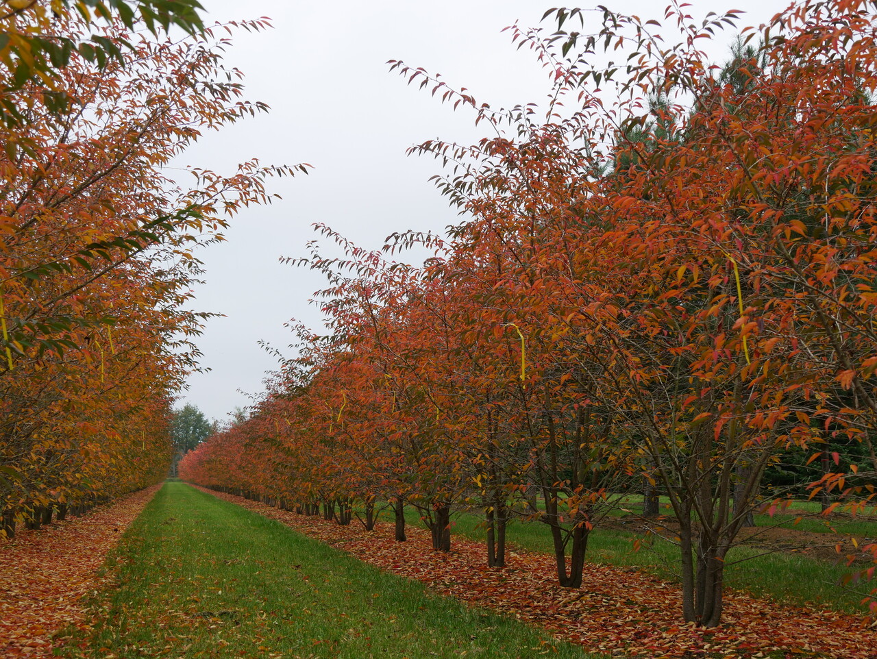 The leaves of Prunus 'The Bride' turn naranja, rojo, púrpura in autumn.